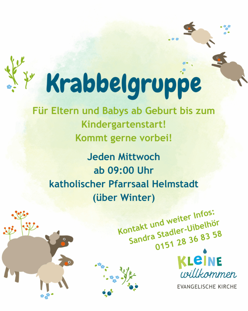 habt ihr Lust auf einen gemütlichen Vormittag mit anderen Mamas und Papas – während eure Kleinen spielen, krabbeln oder einfach dabei sind? Dann kommt zu unserer Krabbelgruppe! Wir treffen uns jeden Mittwoch um 9:00 Uhr unter der katholischen Kirche in Helmstadt. Es erwartet euch ein lockeres Miteinander mit Spiel und Spaß für die Kinder und nettem Austausch für die Eltern. Ganz ohne Anmeldung – kommt einfach vorbei, so wie ihr seid! Wir freuen uns auf viele fröhliche Gesichter – große und kleine!