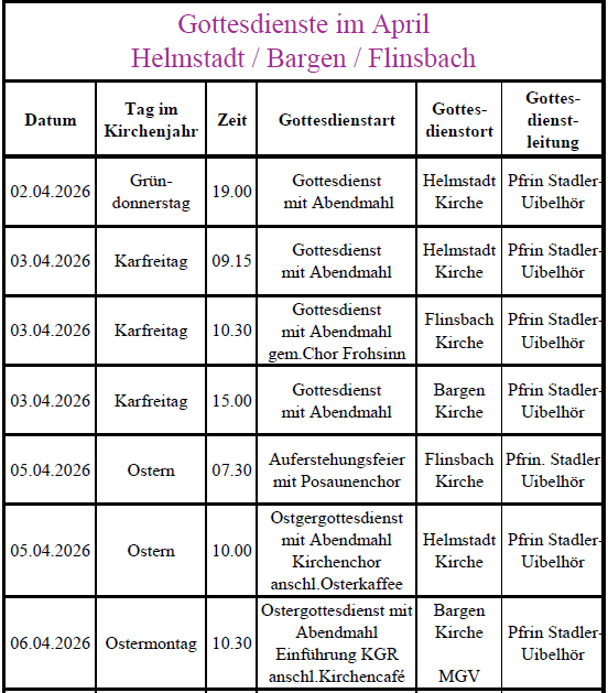 Vom 7. bis 12. April hat Pfrin. Stadler-Uibelhör Urlaub. In Trauerfällen wenden Sie sich bitte an Pfrin. Zollinger aus Reichartshausen, 06262 6213. Das Pfarramt ist in dieser Woche dienstags und freitags besetzt.